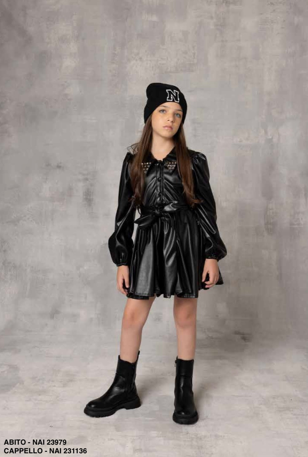 Abito NAICE in ecopelle con borchie sul collo e cintura in vita.