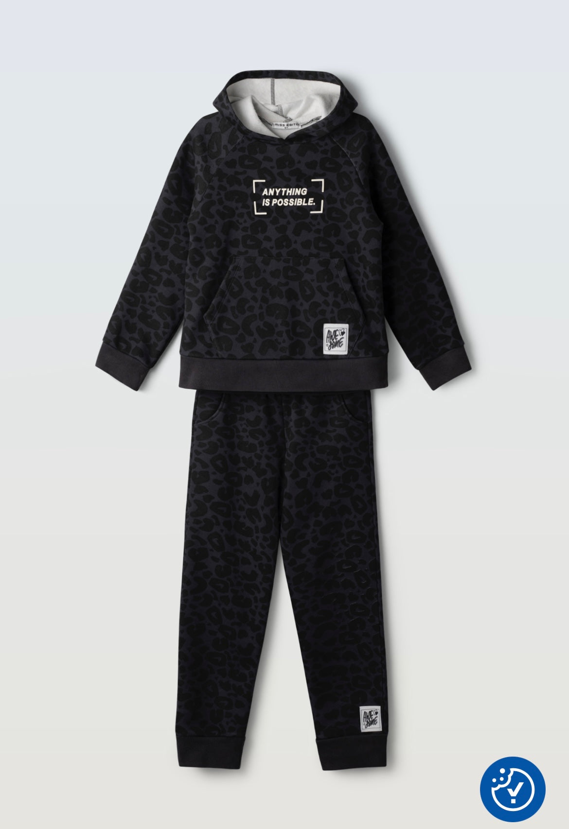 Tuta animalier nera composta da pantalone fondo elastico e felpa con cappuccio